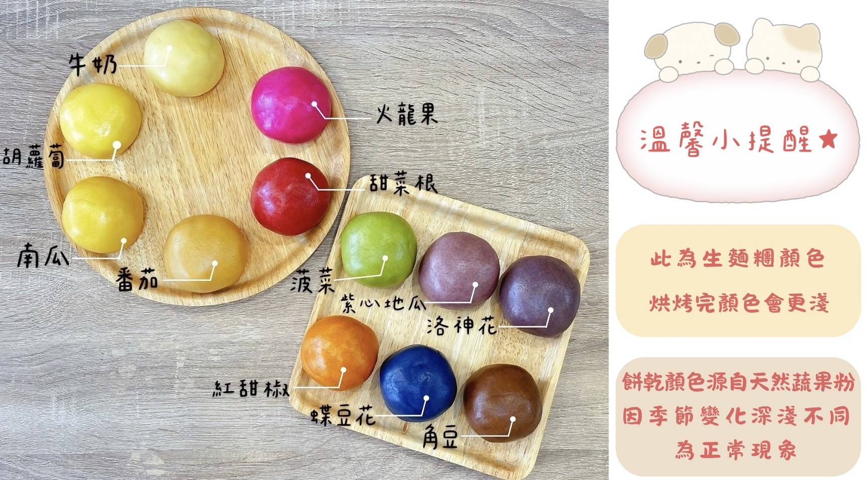餅乾原料:奶油、雞蛋、砂糖、麵粉、天然蔬果粉。
